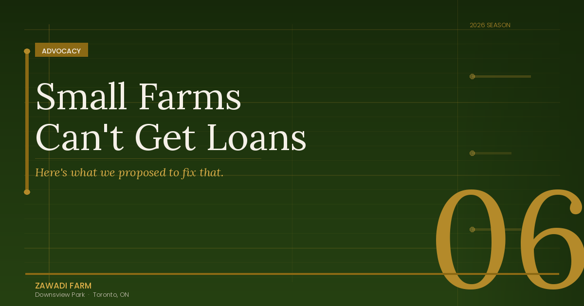 Earlier this year, Zawadi Farm prepared a formal proposal for amendments to the CSBFLP. We brought it to federal representatives including the MP for Toronto Centre. The core recommendations were straightforward: expand loan eligibility to include agricultural infrastructure, regardless of land ownership status. Introduce lower interest rates and flexible repayment terms that account for seasonal cash flow. Create a dedicated small farm loan category with a streamlined application process. And — critically — provide government-backed guarantees for leasehold improvements, so that farms operating on leased land can invest in the infrastructure they need.
